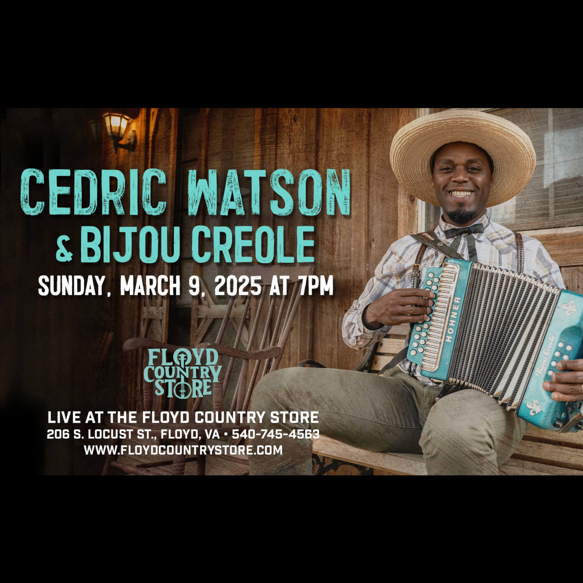 Join us for an evening of Cajun, Creole and Zydeco with 4-time, Grammy-award nominated fiddle player Cedric Watson and Bijou Creole. Sunday, March 9, 2025 at 7PM.