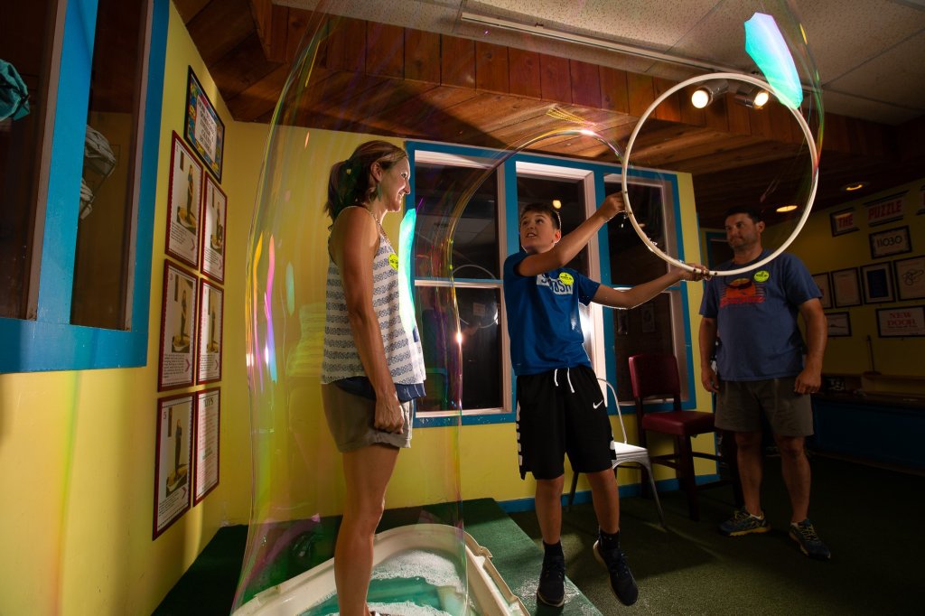 Mystery Hill has been amazing Parkway visitors for over 70 years. Fun and educational for the entire family. Explore North Carolina’s only Natural Gravitational Anomaly (see above photo), experience hands-on science activities, create giant soap bubbles big enough to surround an adult,