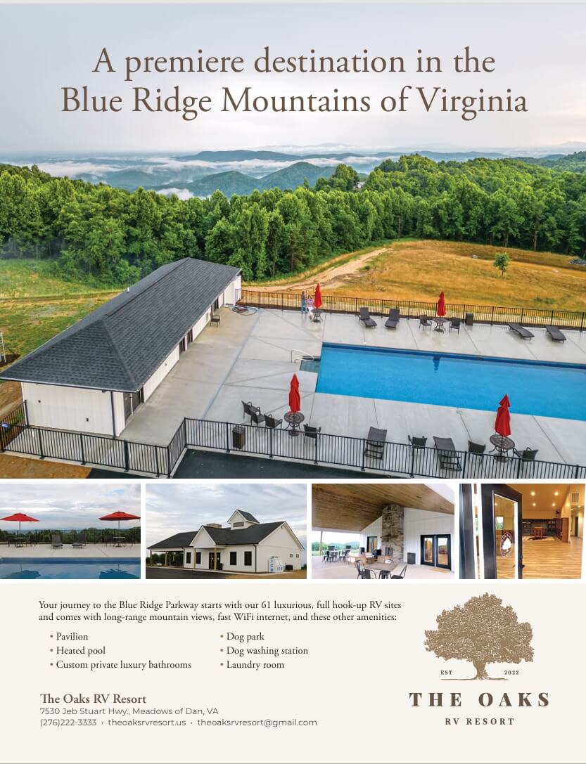 The Oaks RV Resort is a premiere destination nestled in the Blue Ridge Mountains of VA. This resort was thoughtfully built to provide each guest with the best amenities, to ensure each moment of the stay is enjoyable. Let The Oaks be your homebase as you explore the Blue Ridge Mountains and the surrounding communities.