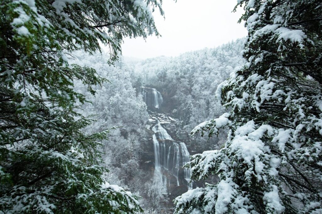 Whitewater Falls by Courtney Paris Robinson - Visiting Waterfalls. Remember to exercise caution in winter as some trails may be slippery. The trails are less crowded in cold weather, and it is a special treat, when the weather is just right, to view frozen waterfalls. Bryson City & Swain County, North Carolina provide a variety of hiking options, from sections of the Appalachian Trail to hikes on public lands surrounding Fontana Lake to the waterfalls in the Deep Creek area of the Great Smoky Mountains National Park. Their website describes several hikes in the region. East of Asheville in McDowell County, you’ll find easy hikes to both Tom’s Creek Falls and Catawba Falls. Even popular Linville Falls is accessible from a US Forest Service access point when the Parkway is closed. Many waterfalls can be found throughout the regions surrounding the Parkway. Some can be accessed with little or no hiking like Looking Glass Falls in Transylvania County.